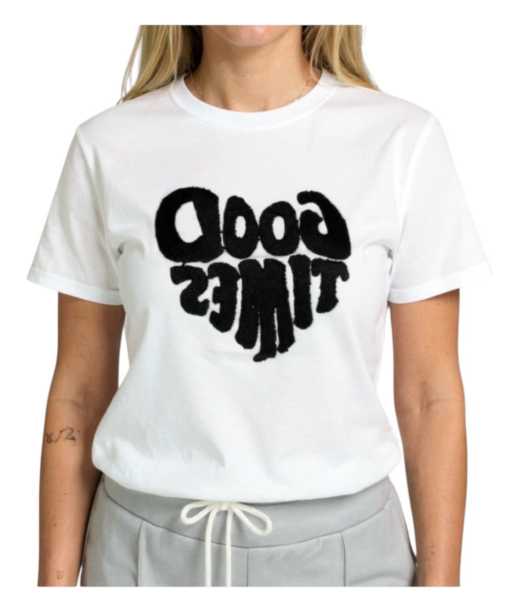 Het Wit T-Shirt Good Times valt prachtig aangesloten en de applicatie blijft ook na het wassen mooi van structuur. Bekijk ook onze collectie tassen.