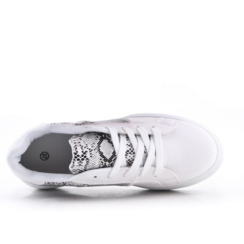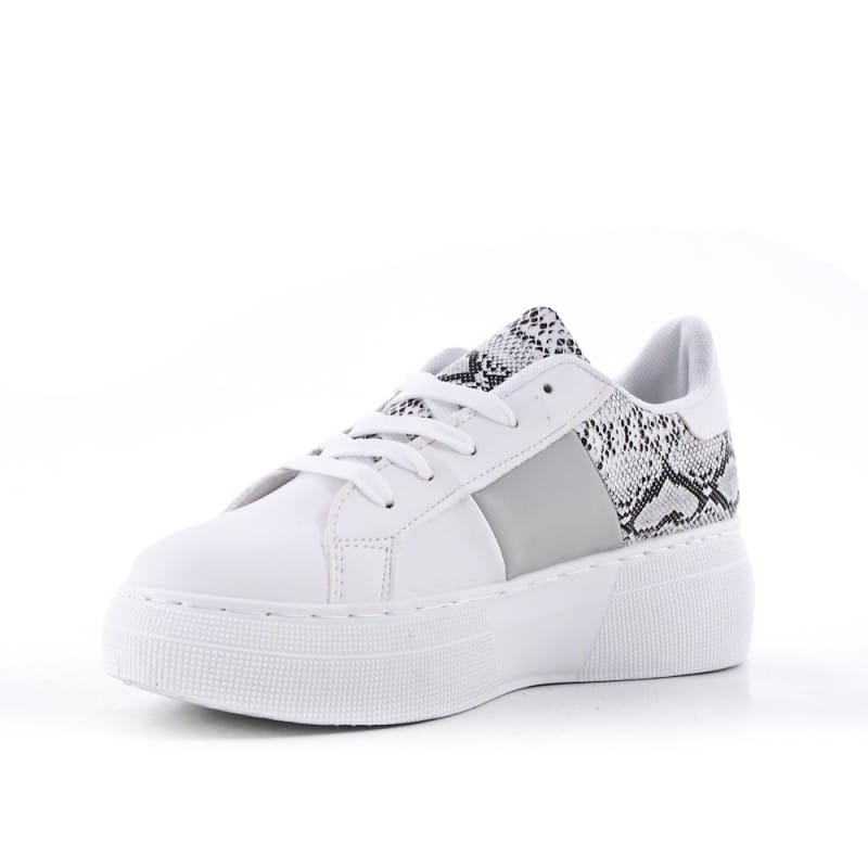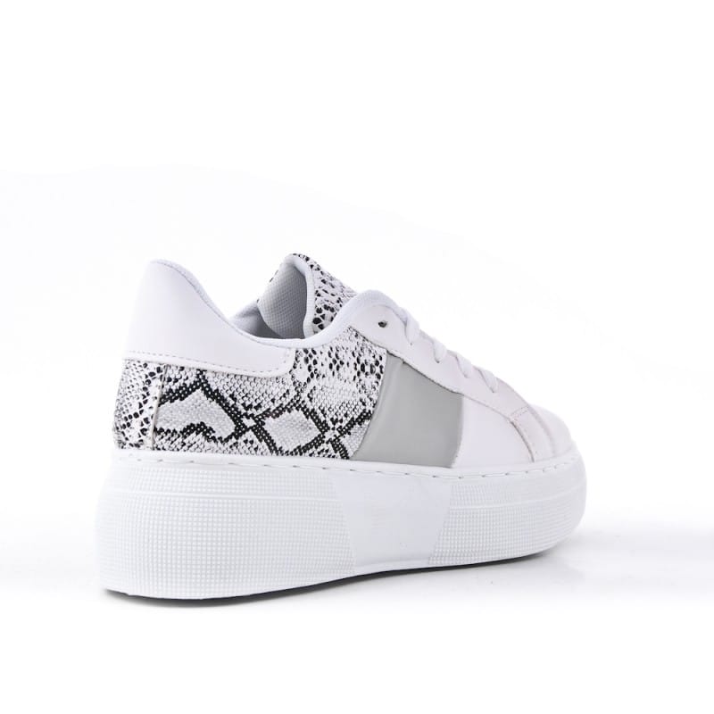 De Witte Sneaker Snake geeft een frisse en modieuze impuls aan je dagelijkse verschijning. Deze karaktervolle sneakers combineren een tijdloos wit ontwerp met een gedurfde slangenprint op de hiel en zijkanten, wat zorgt voor een overzichtelijk maar uniek beeld. De opvallende platformzool van 5 cm geeft niet alleen een extra impuls aan je lengte, maar biedt ook een moderne valling die perfect past bij de huidige ‘chunky sneaker’ trend. Het samenspel tussen het witte materiaal en de textuur van de print reageert op de lichtinval, waardoor de schoenen een luxe uitstraling krijgen.